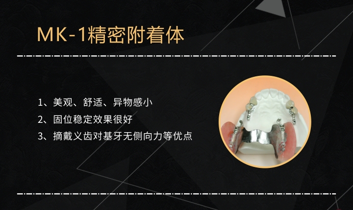 兼有固定活动义齿的优点,从一定程度上解决了对义齿固位力、咀嚼功能及美观舒适方面的要求,以及医生对基牙保护的要求。MK-1通过对附着体将力传导给基牙,大大改善了咀嚼力。同时MK-1体积小,摘戴时对基牙不产生侧向力,具有良好的固位作用。